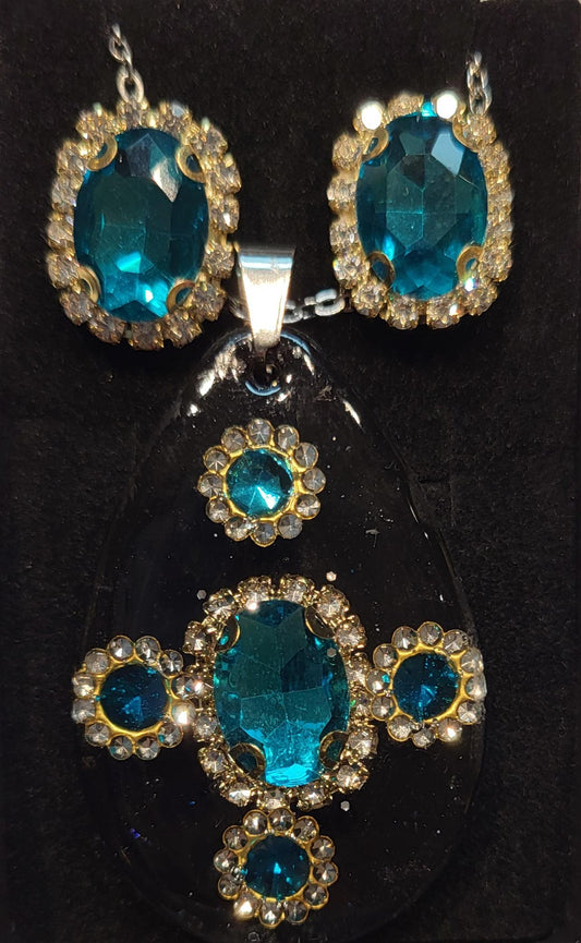 Mode-Schmuck "Resin-Dreams" Anhänger und Ohrstecker (schwarz mit türkisfarbenen Strasssteinen)