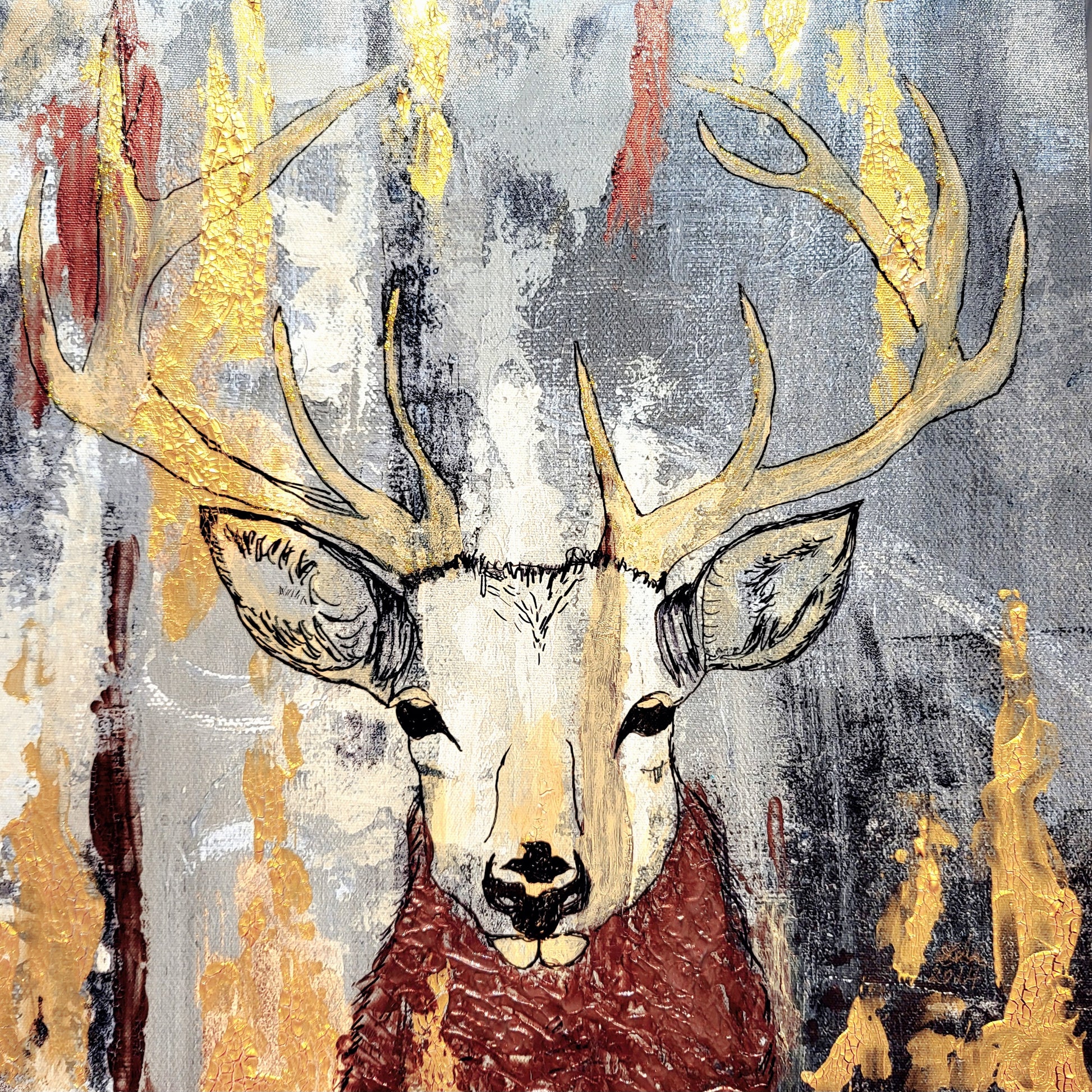 Abstraktes Bild in Acryl mit Goldeffekten mit Hirschportrait Maße 40x40x5cm