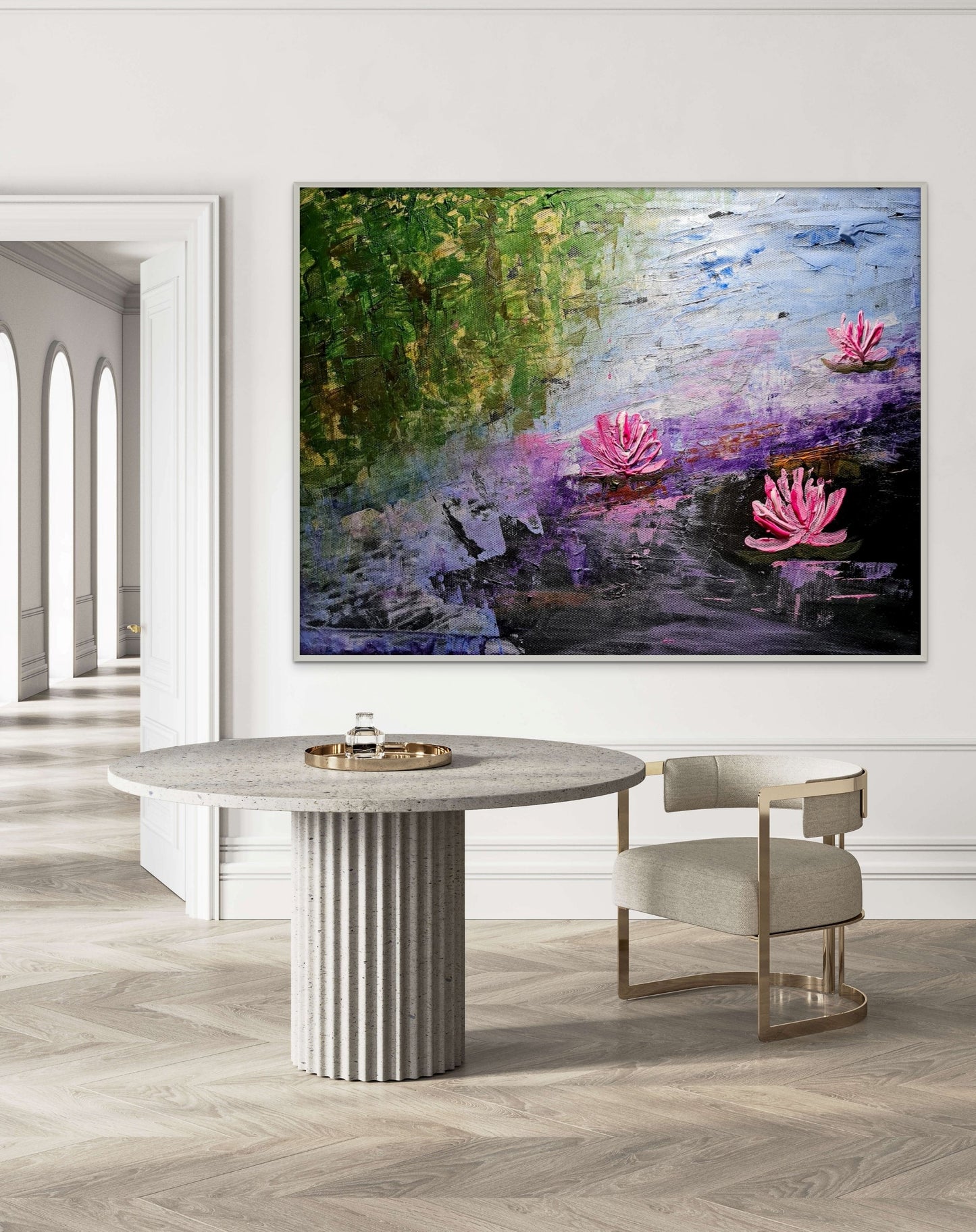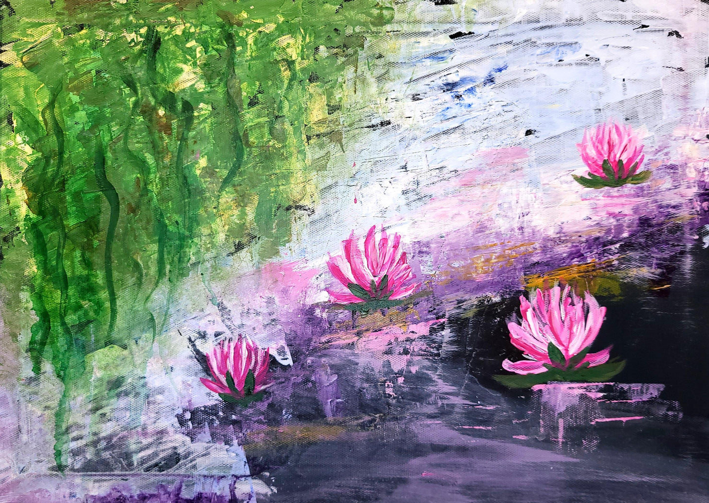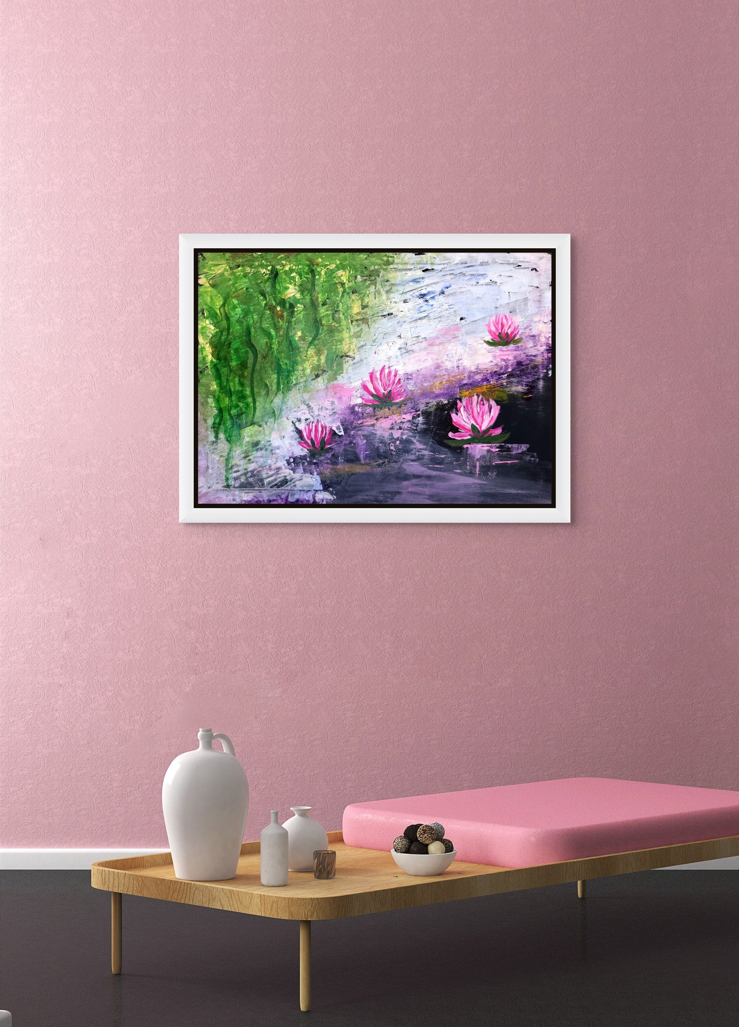 Abstraktes Gemälde in Acryl "Seerosenteich" in weißem Schattenfugenrahmen.