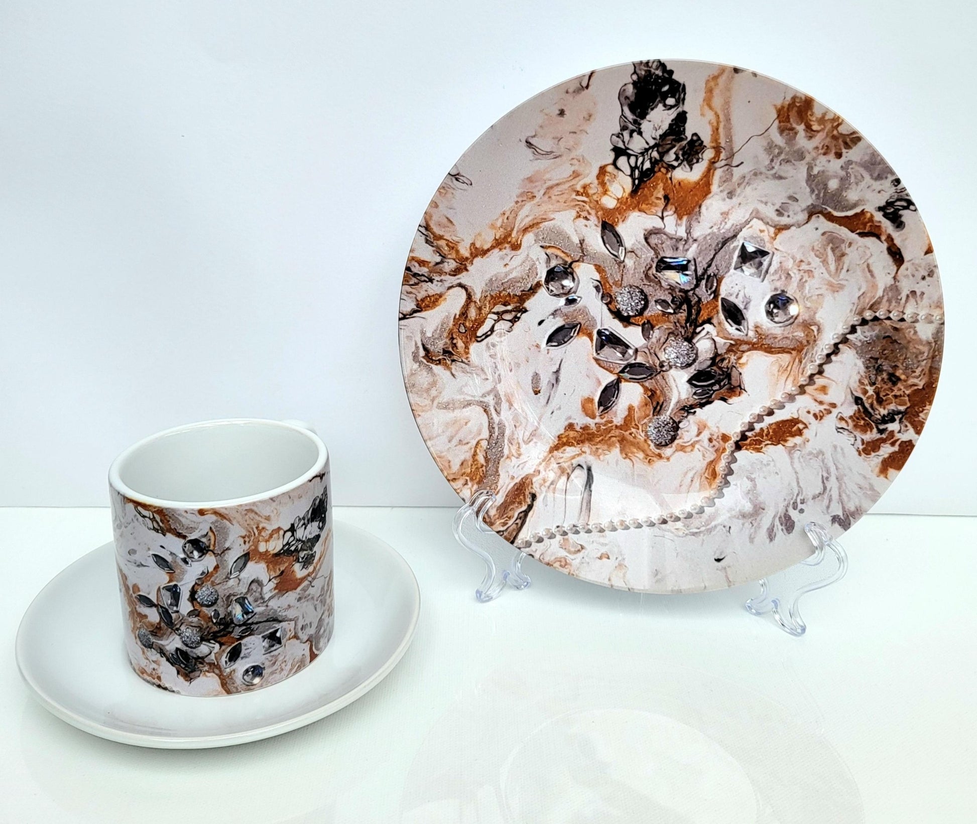 Exklusives Design (jedes Set wird individuell gestaltet, also keine Massenware!) trifft auf praktische Verwendung: Der Teller ist aus einem PBA-freien Polymer (aus dem die Kinderteller gefertigt werden) und die Tasse aus Keramik mit Hochglanzfinish.