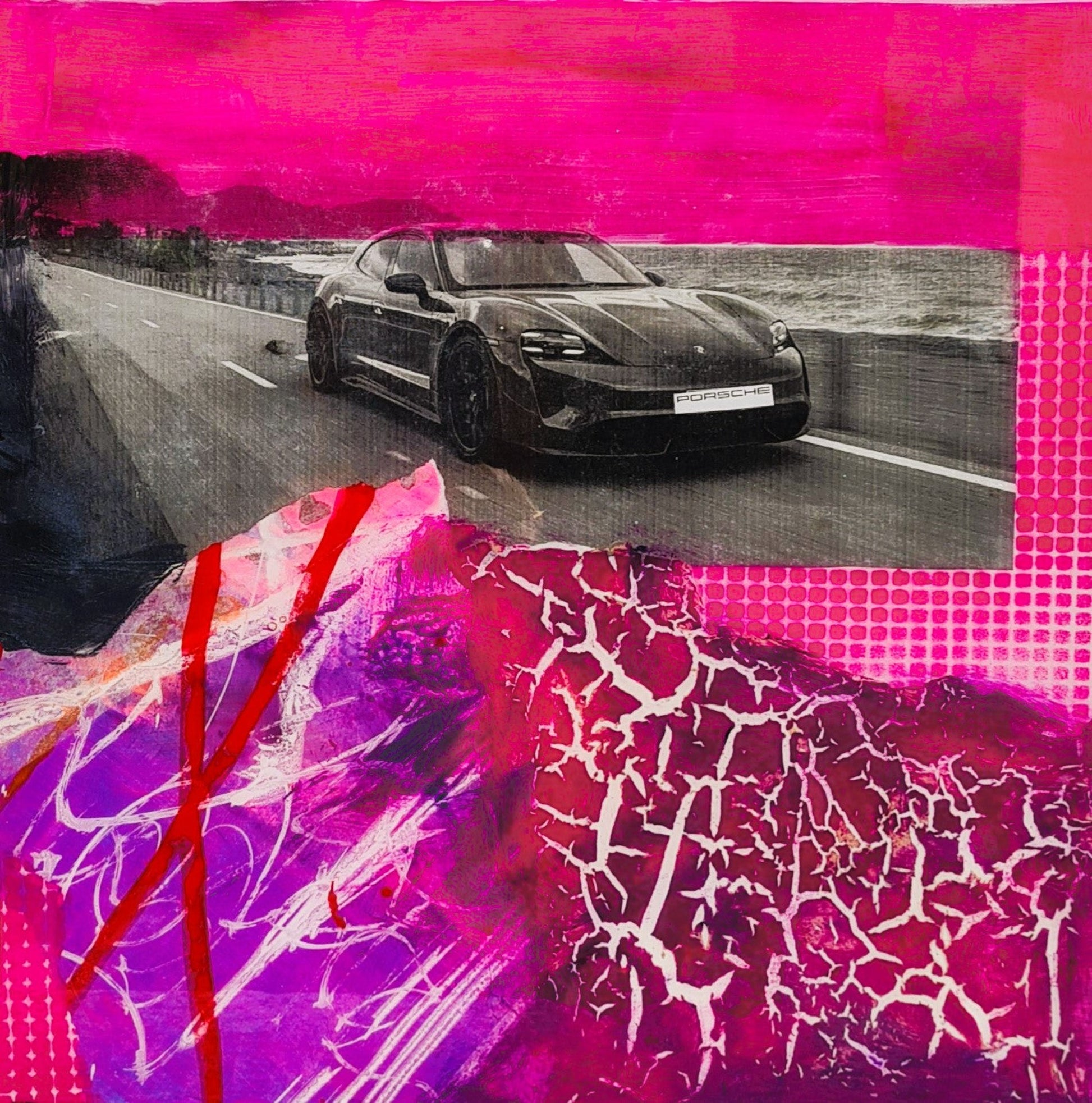 Porsche in Mixed Media, Kunstwerk in Epoxidharz gegossen, 30x30cm, extra breiter Rand