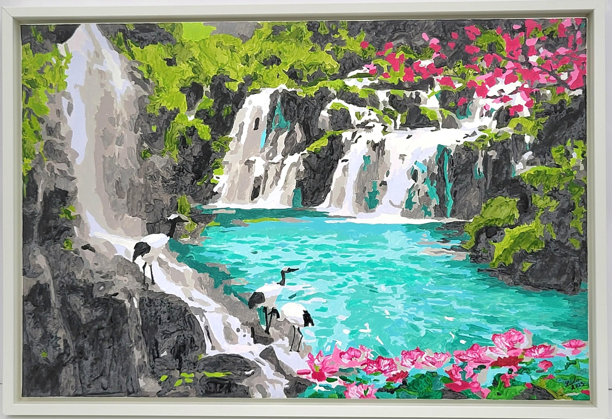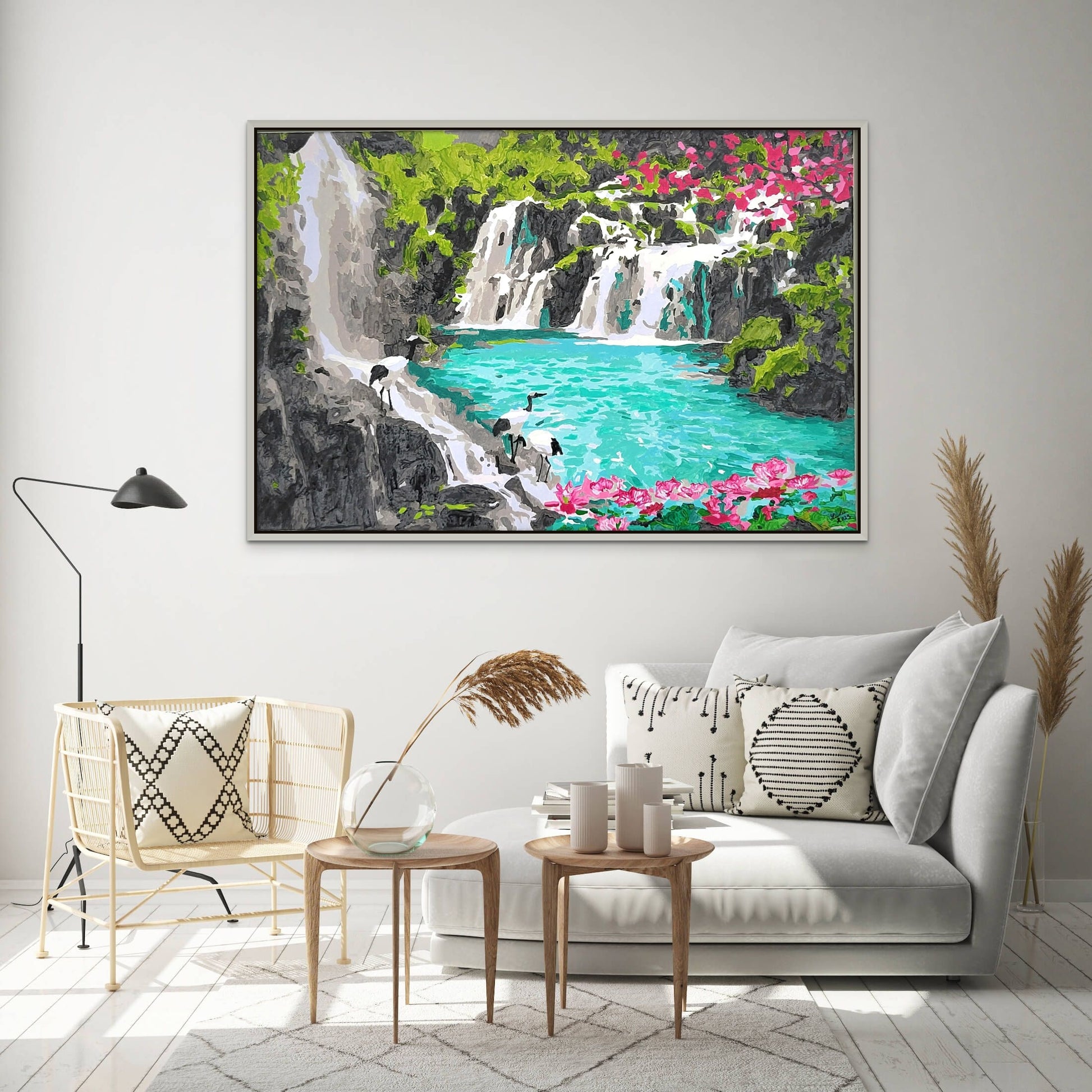 Sanfte Wasserfälle vor türkisfarbenem See. Umrahmt von Seerosen.