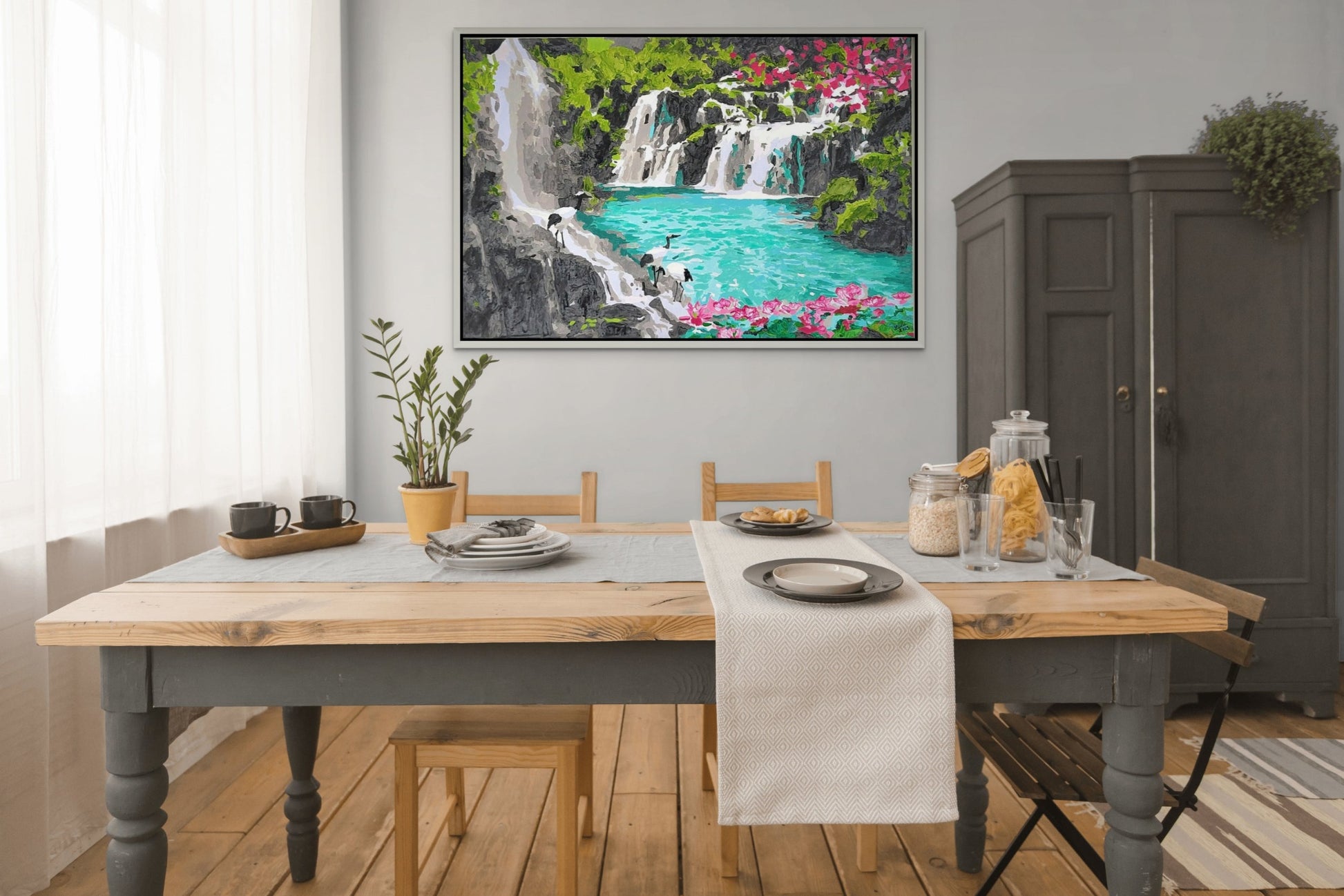 60x40cm mit weißem Schattenfugen-Rahmen.
