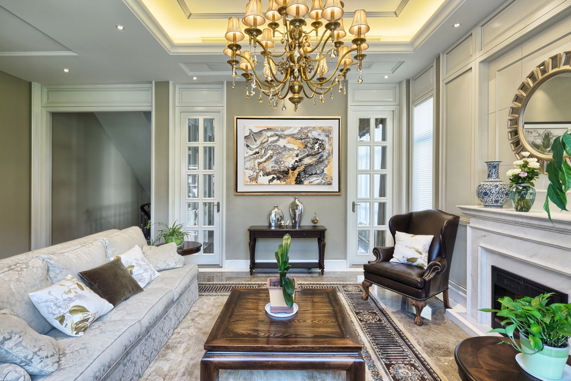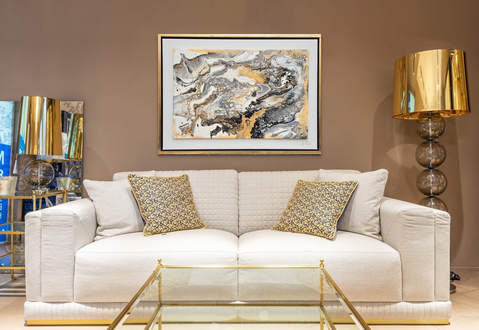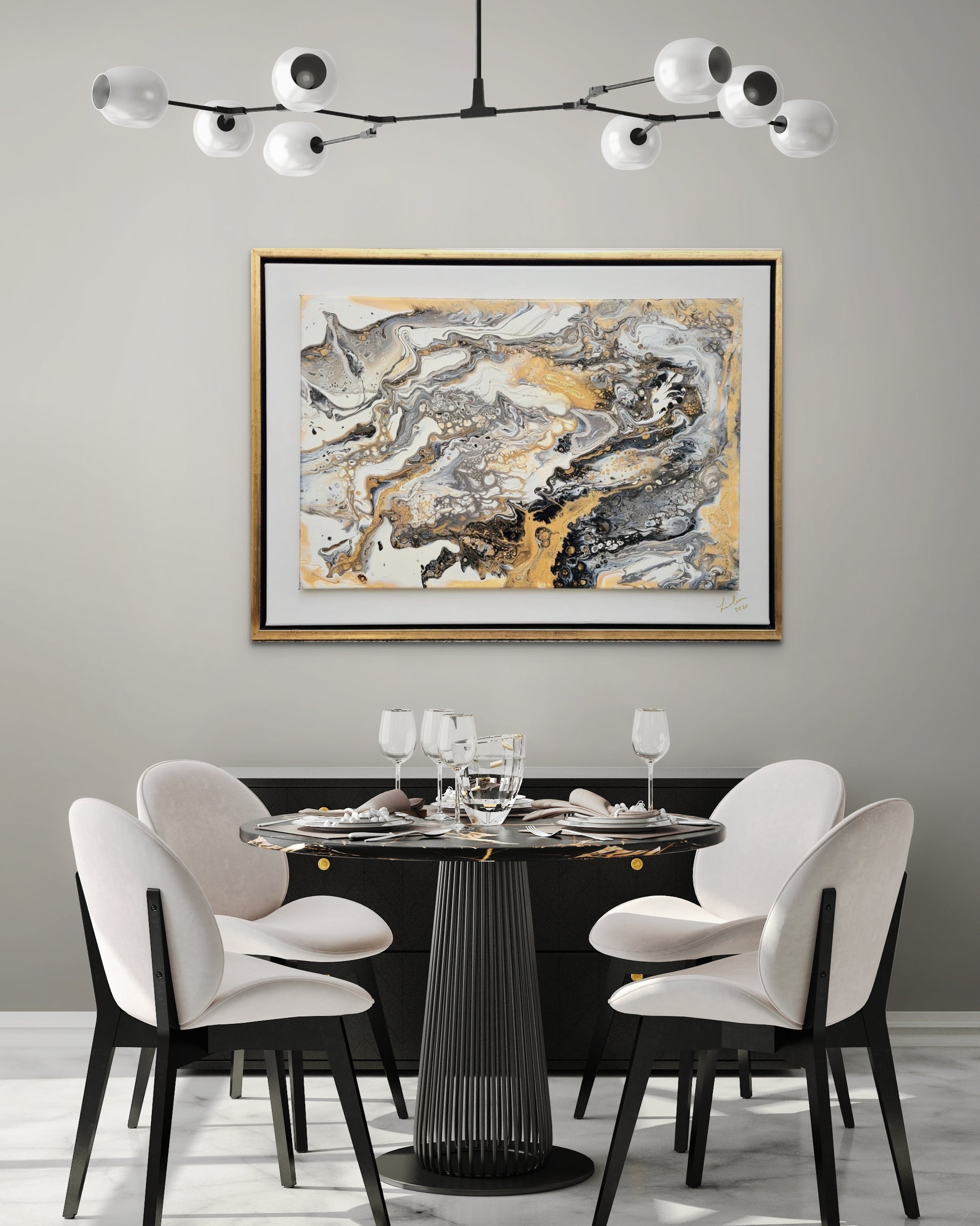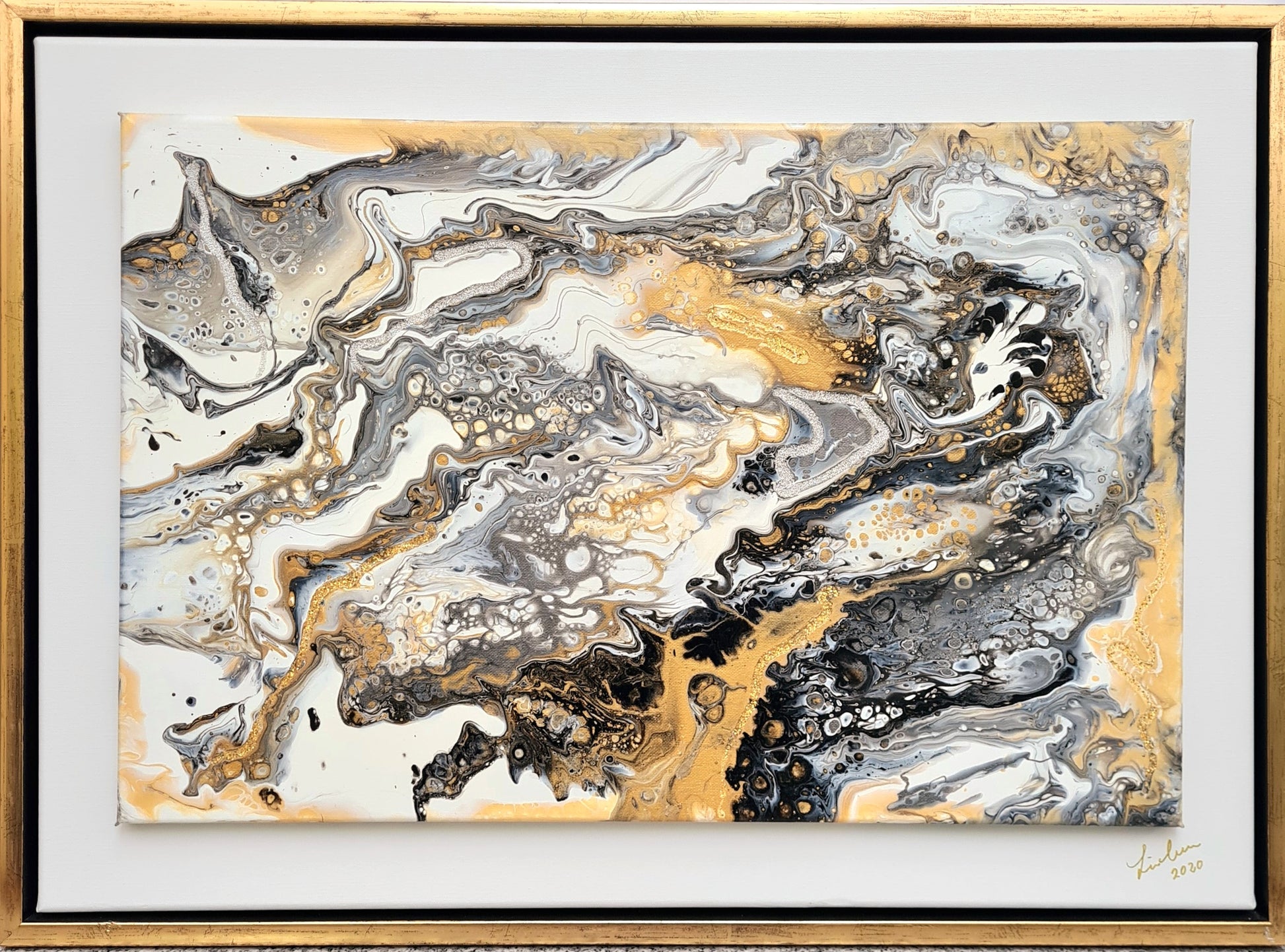 Abstraktes Bild in Acryl in Pouring Technik erstellt. Die Farben leuchten in Silber-Gold-Weiß-Schwarz. Ein elegantes Kunstwerk, was auch in eine moderne Umgebung passt. Maße: 75 x 55cm