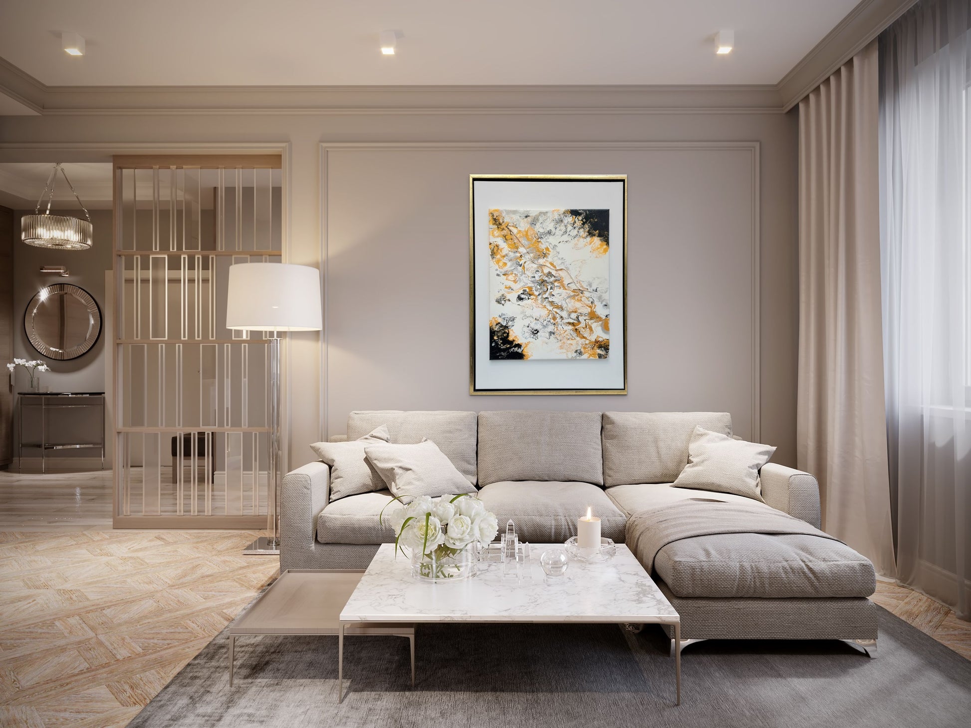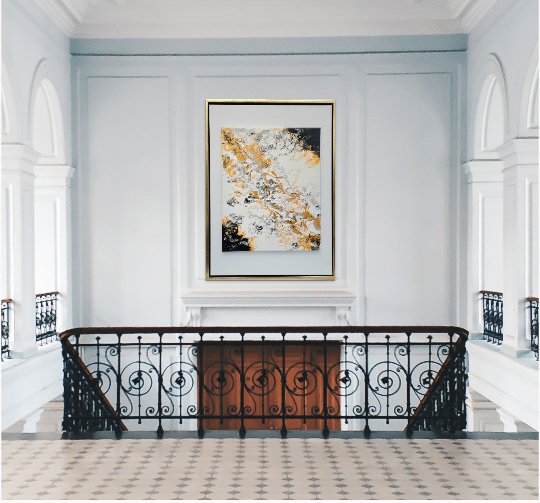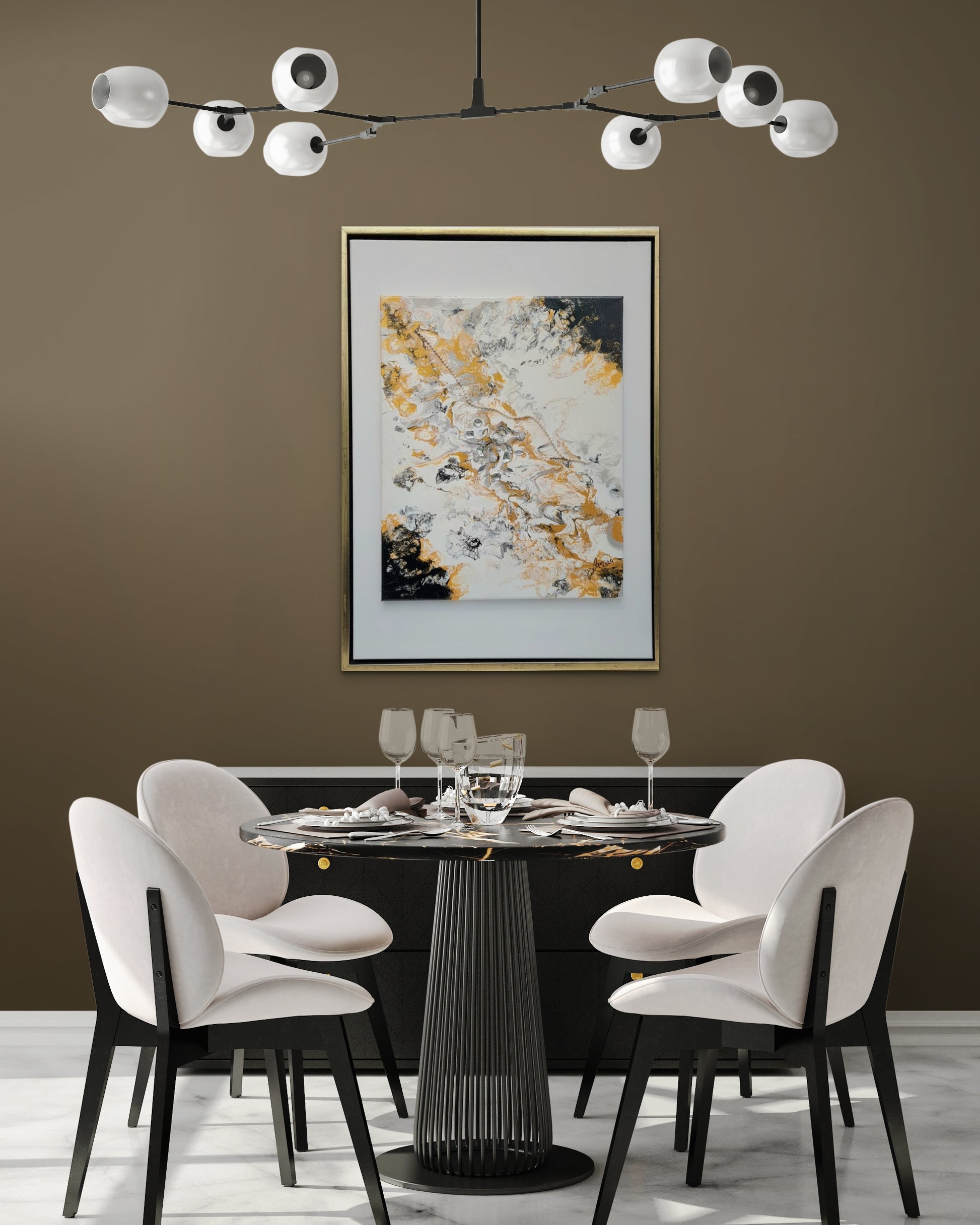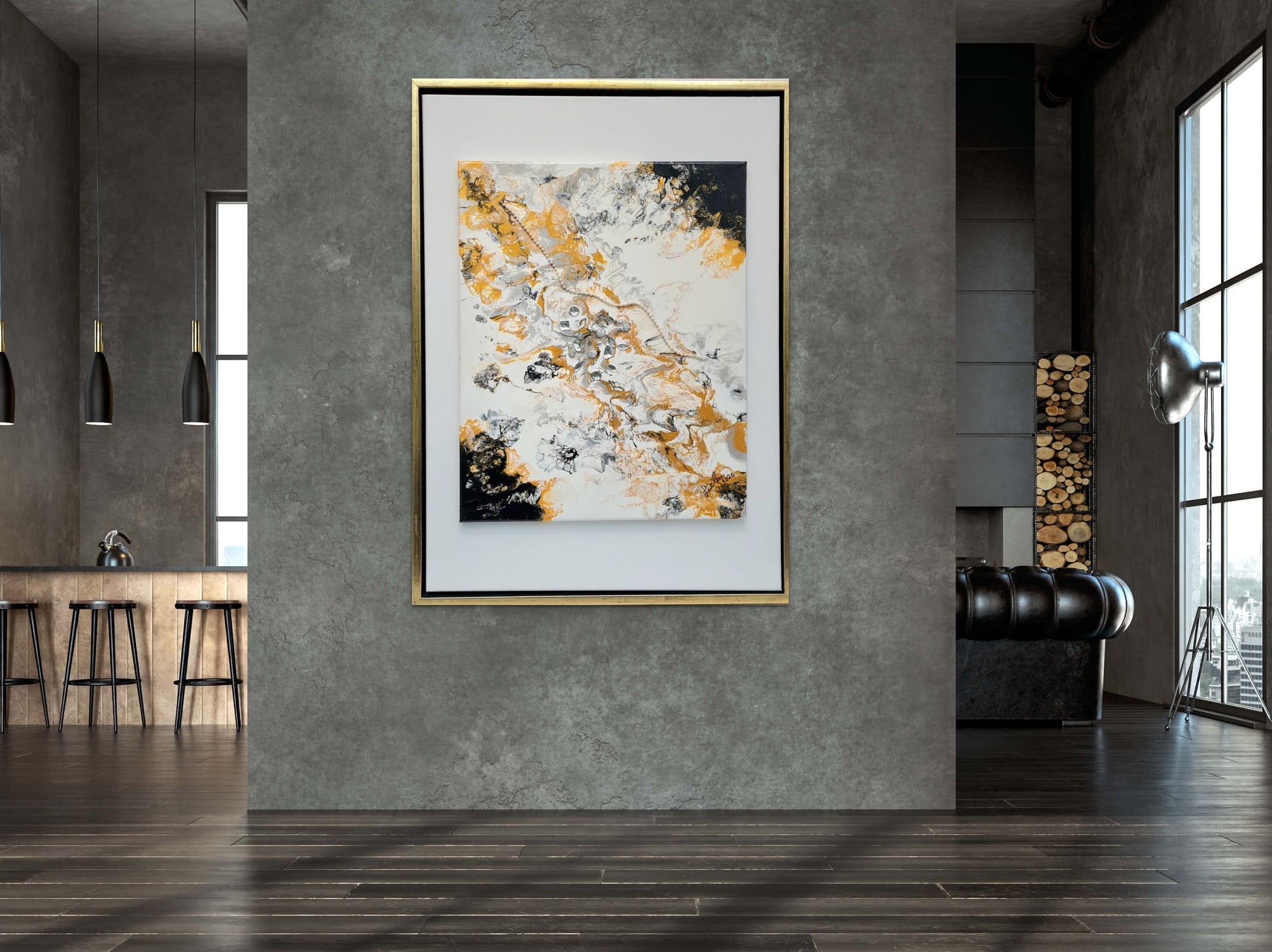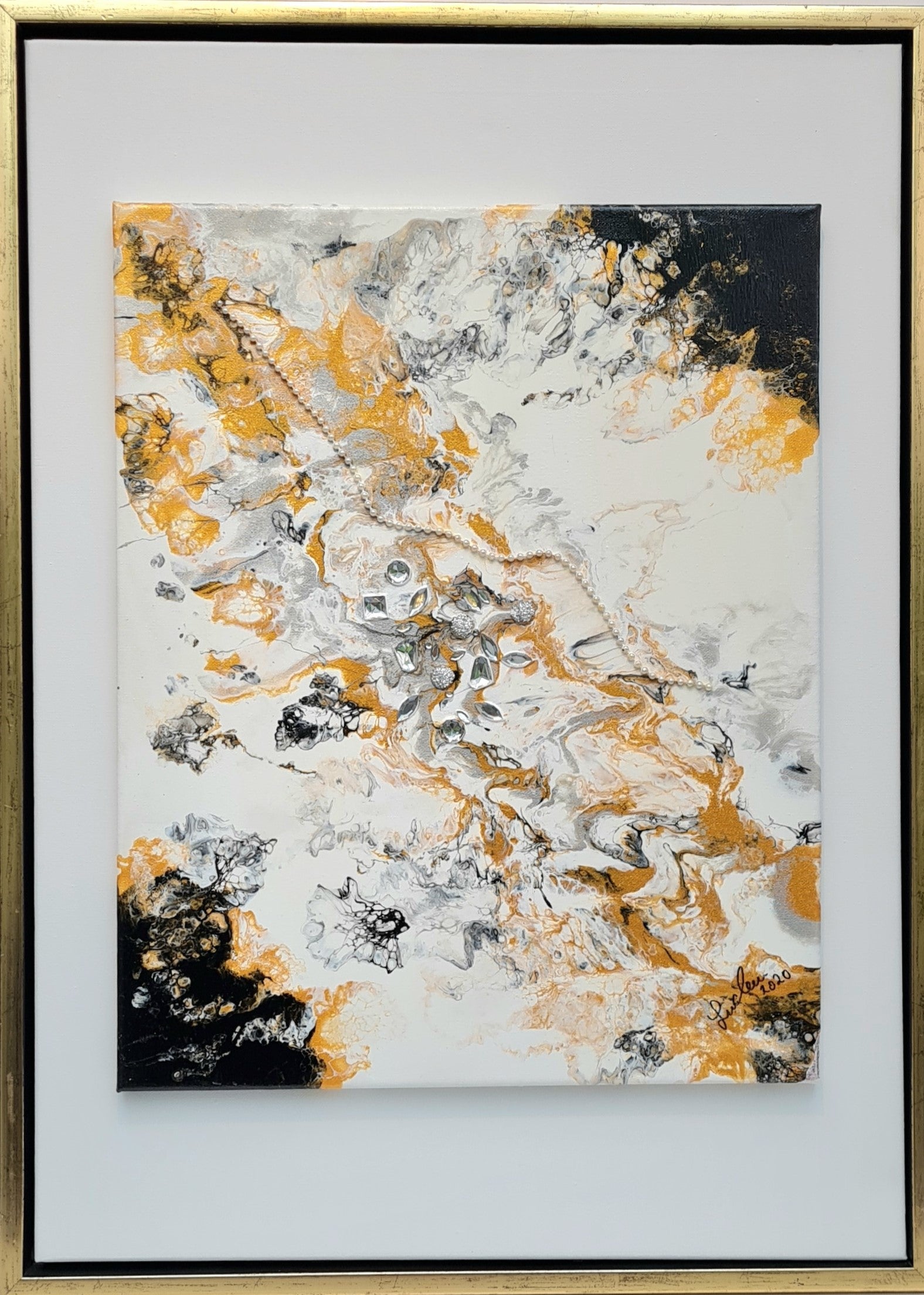 Abstraktes Bild in Acryl in Pouring Technik erstellt. Die Farben leuchten in Silber-Gold-Weiß-Schwarz. Ein elegantes Kunstwerk, was auch in eine moderne Umgebung passt. Mit Svarowski Elementen. Die Maße betragen: 55 x 75cm.