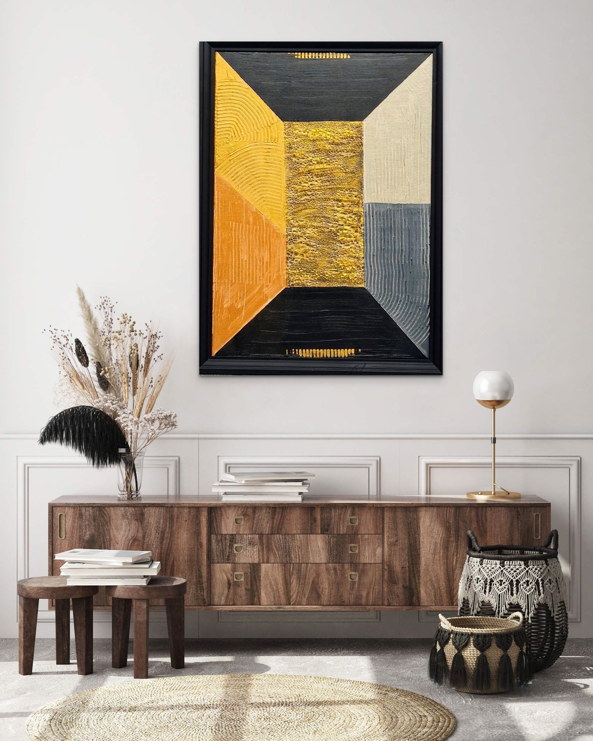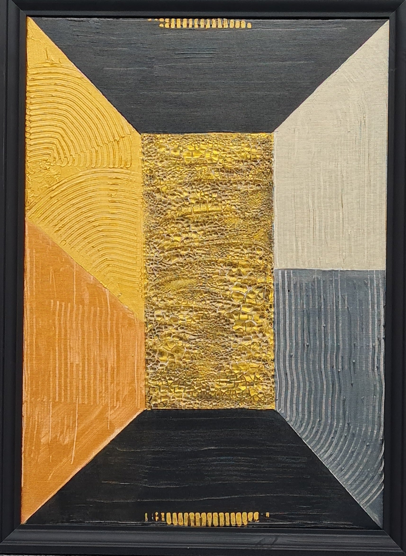 "The golden door" symbolisiert die Herausforderung, auf Türen "ohne Klinke" zuzugehen, damit sie sich öffnen können. Bei einem Laden müssen wir auch über die "Induktionsschleife" gehen, damit sich die Türen öffnen können. Dieses Werk soll Lust machen, sich auf unbekanntes Terrain zu begeben und wie ein neugieriges Kind entdecken, was es Neues zu erkunden gibt. 60 × 80 cm